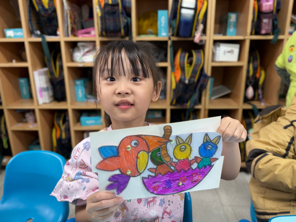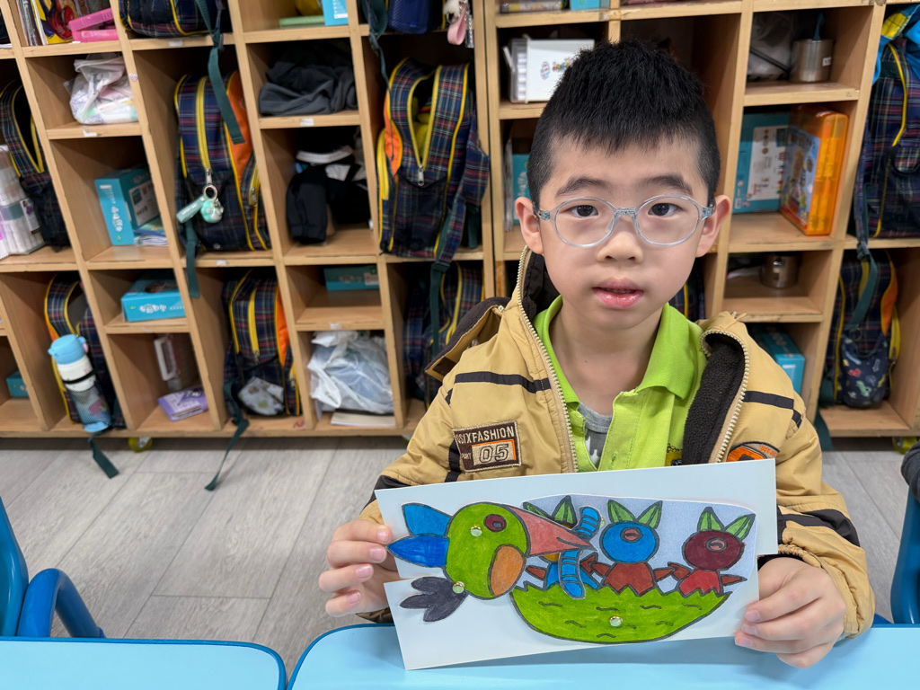 透過鳥媽媽照顧小鳥的畫面,讓寶貝感受親情中的陪伴與呵護。 孩子運用繽紛色彩完成作品,也畫出心中溫暖的愛。