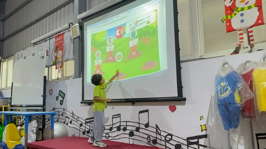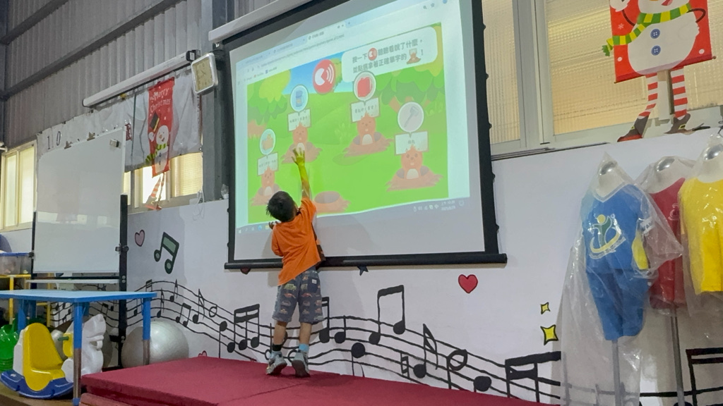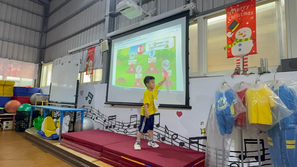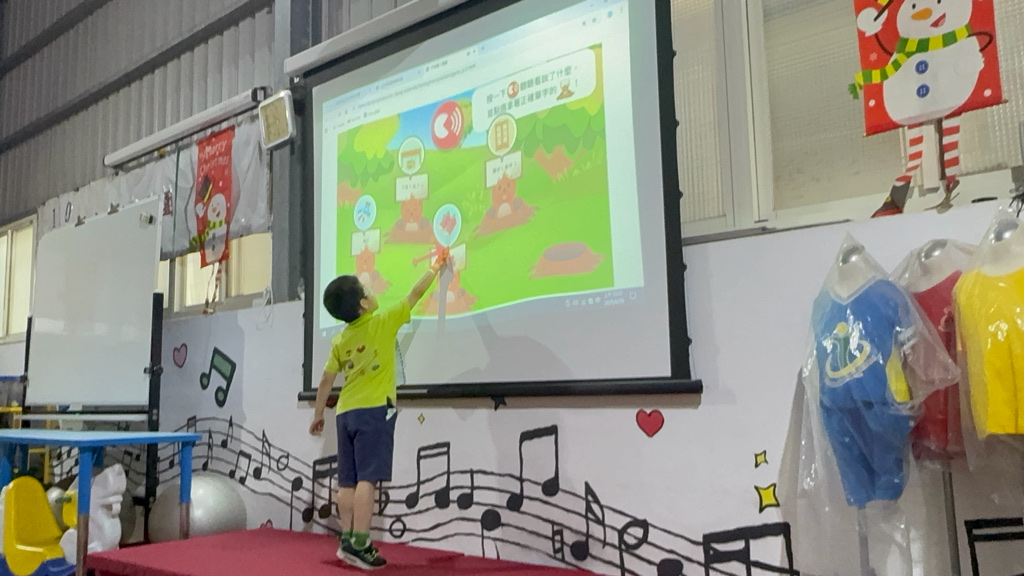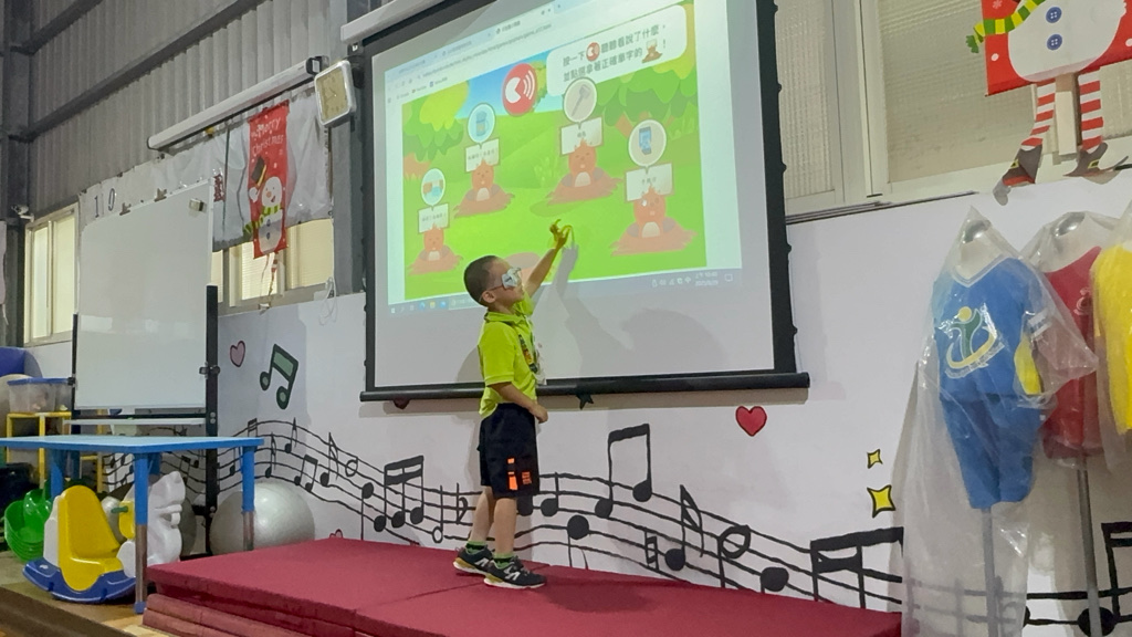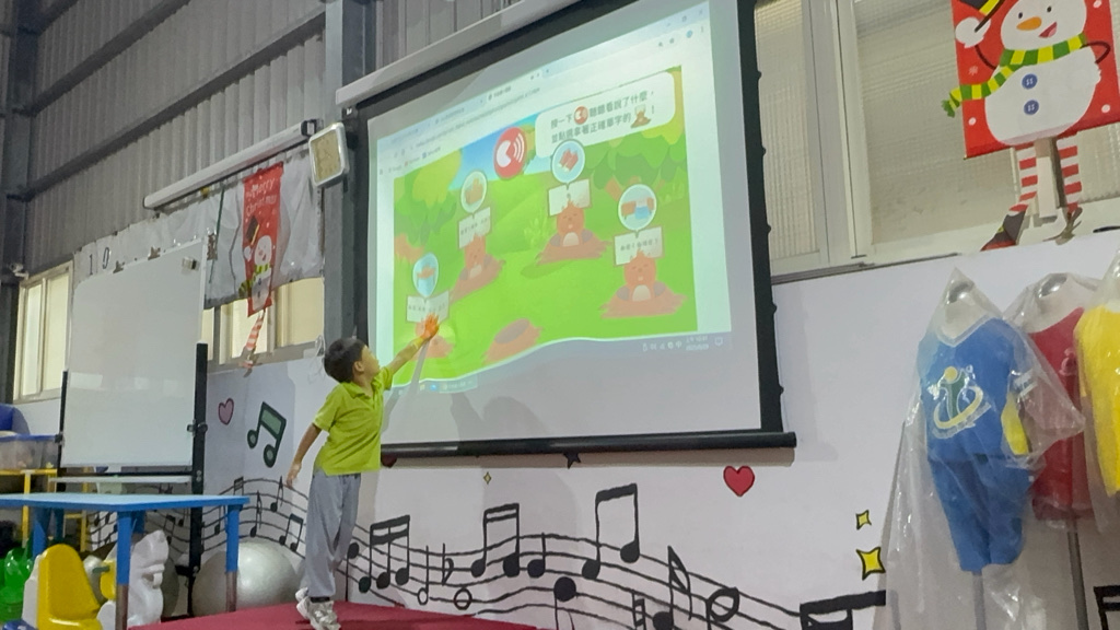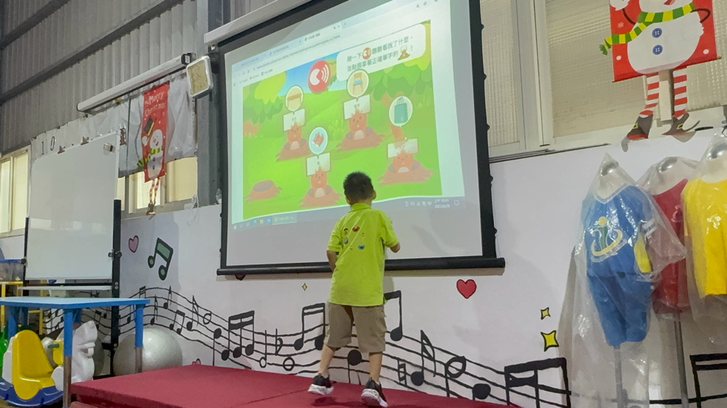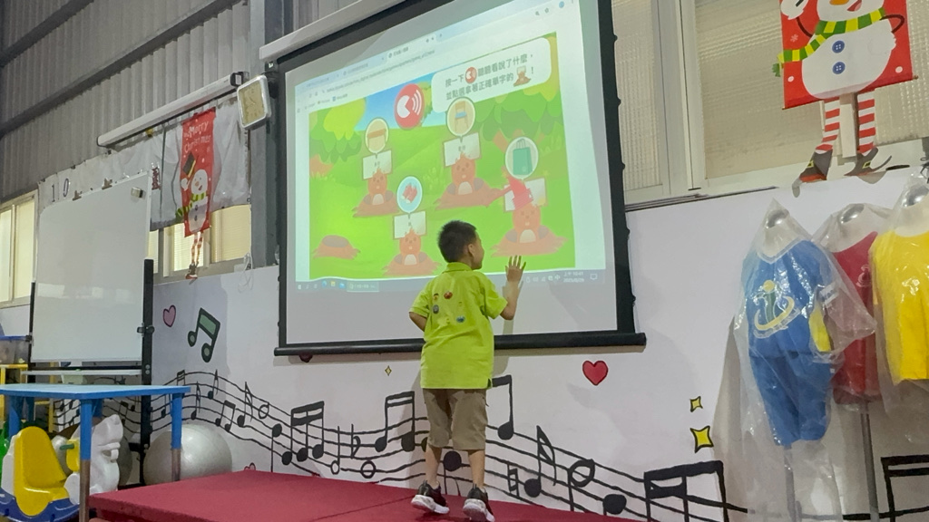 運用電子白板,帶領幼兒認識(書包、櫃子、在前面、後面……)