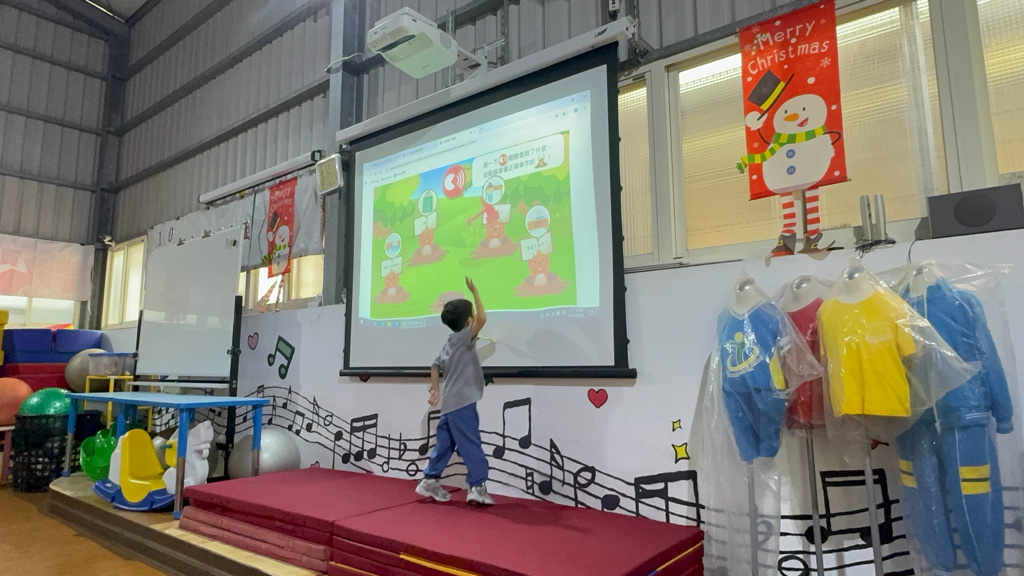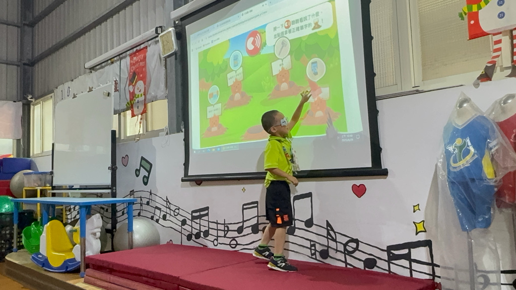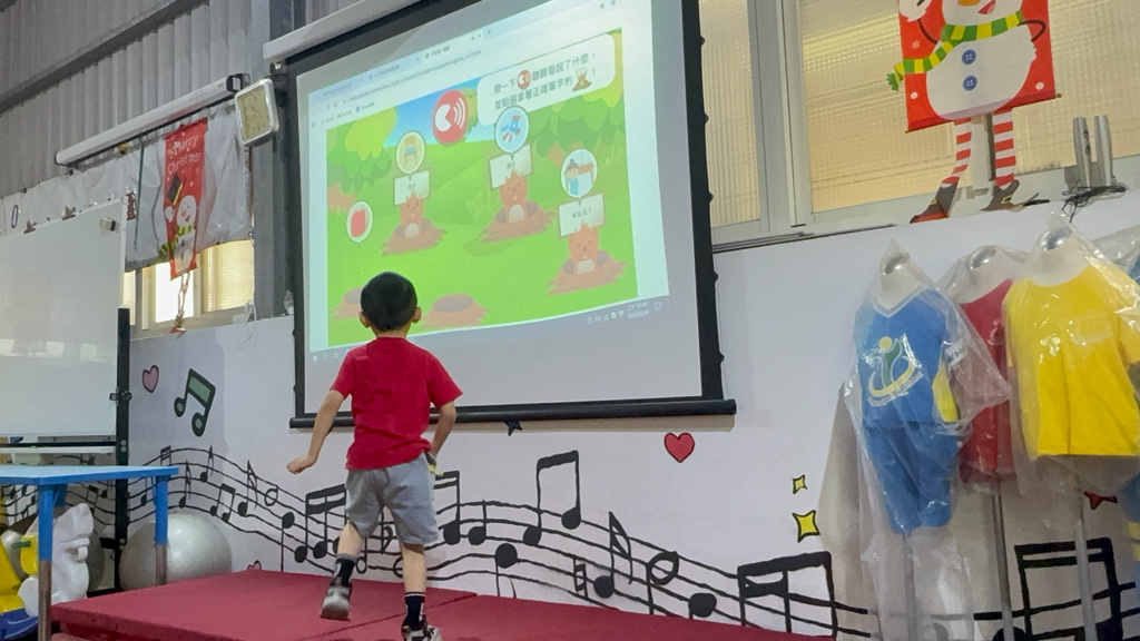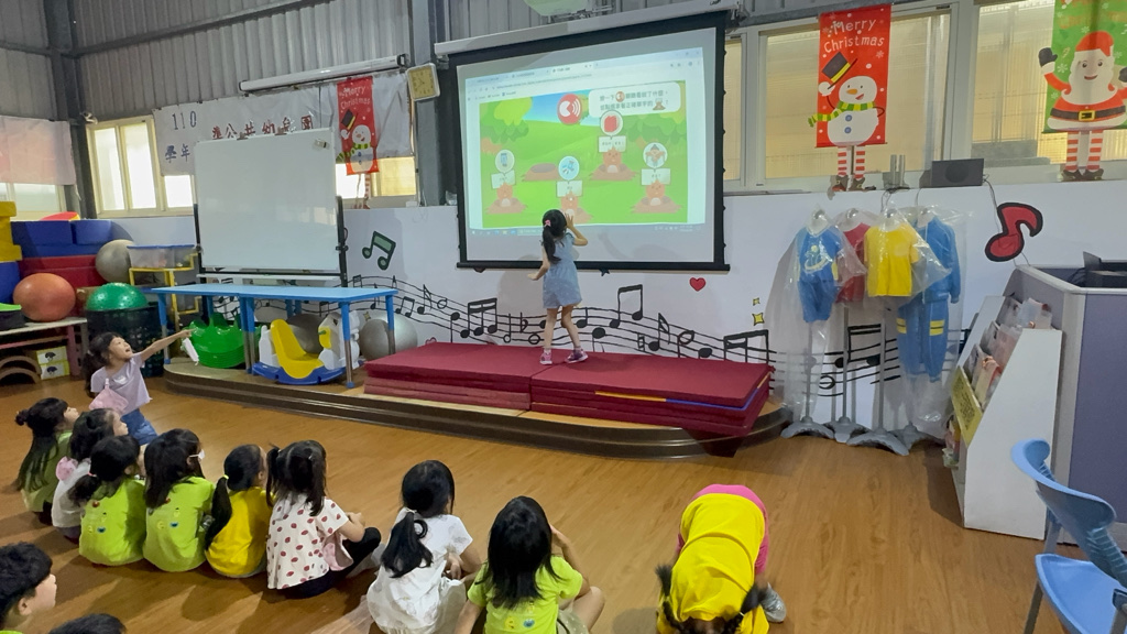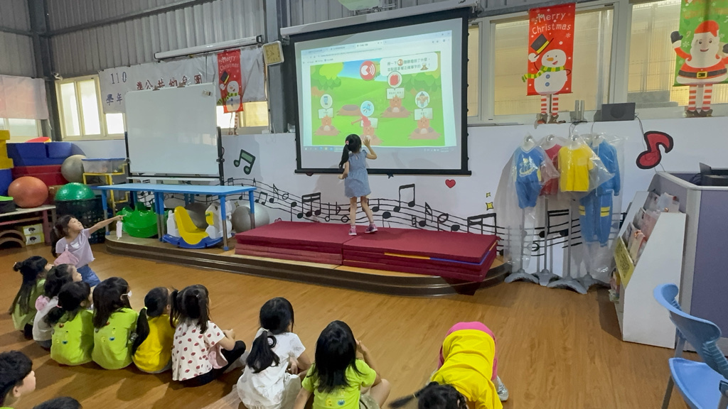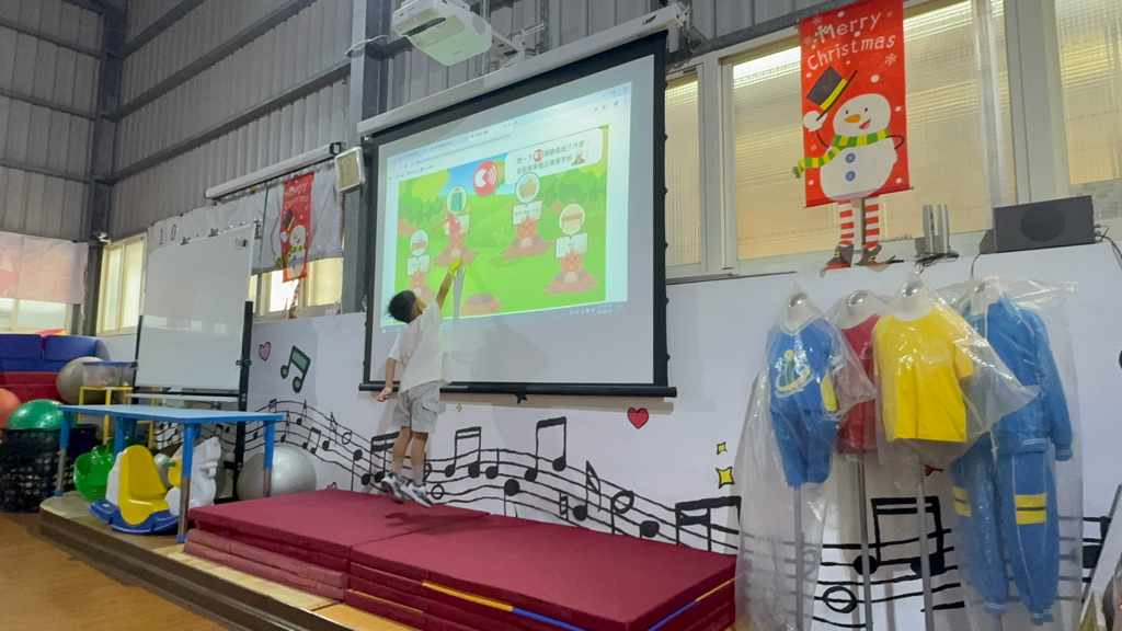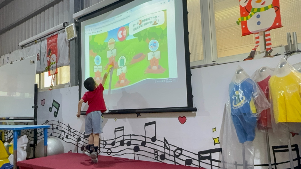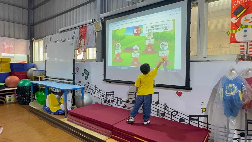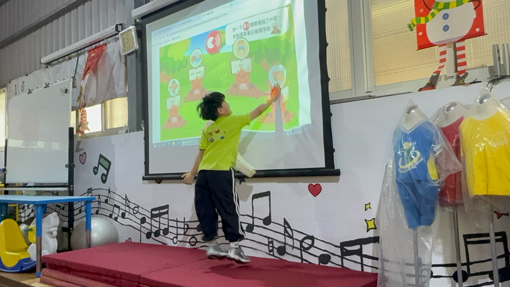 運用電子白板,帶領幼兒認識(書包、櫃子、在前面、後面……)