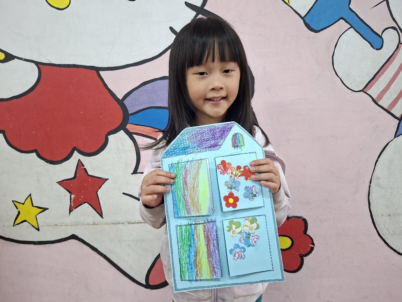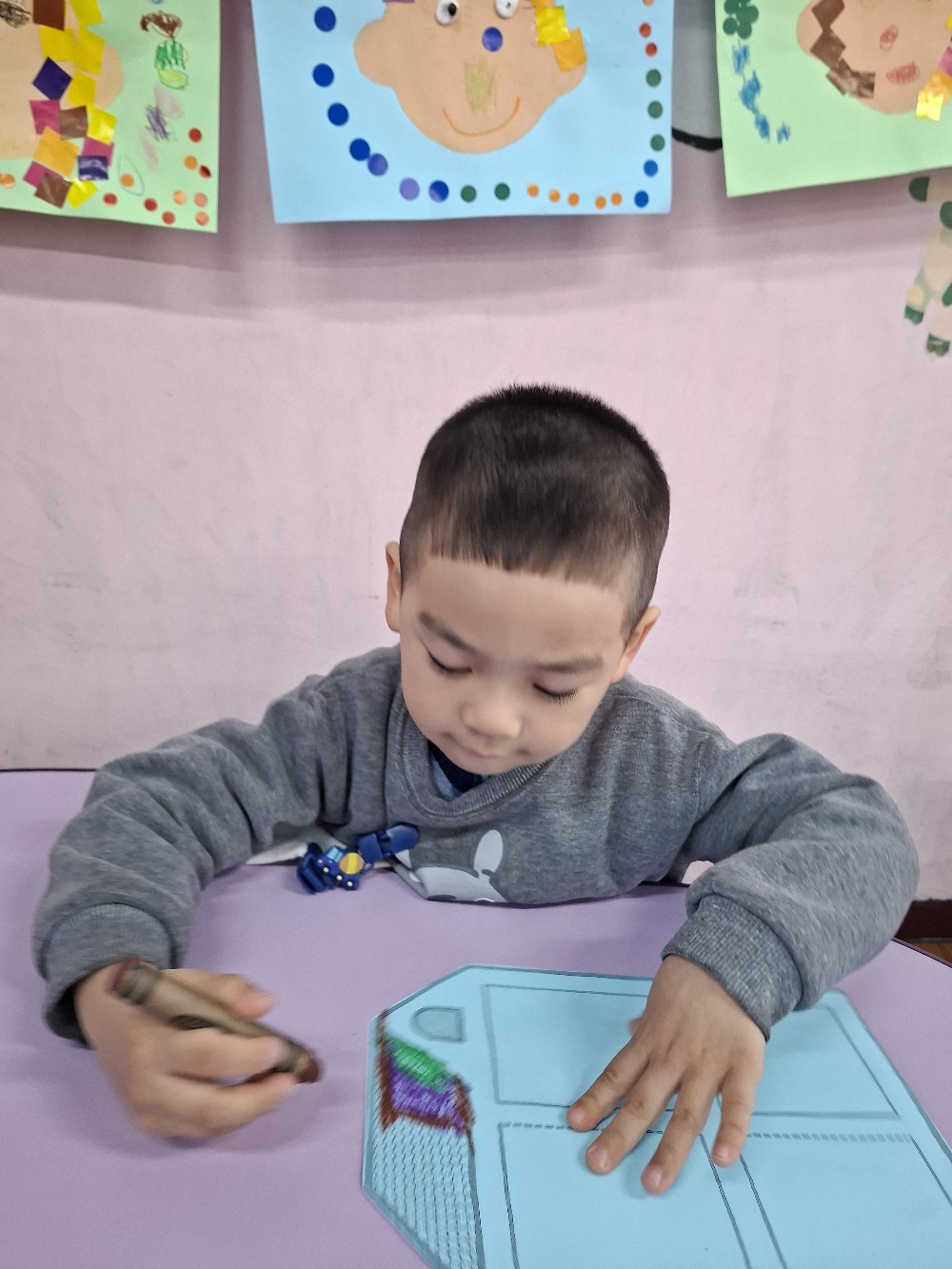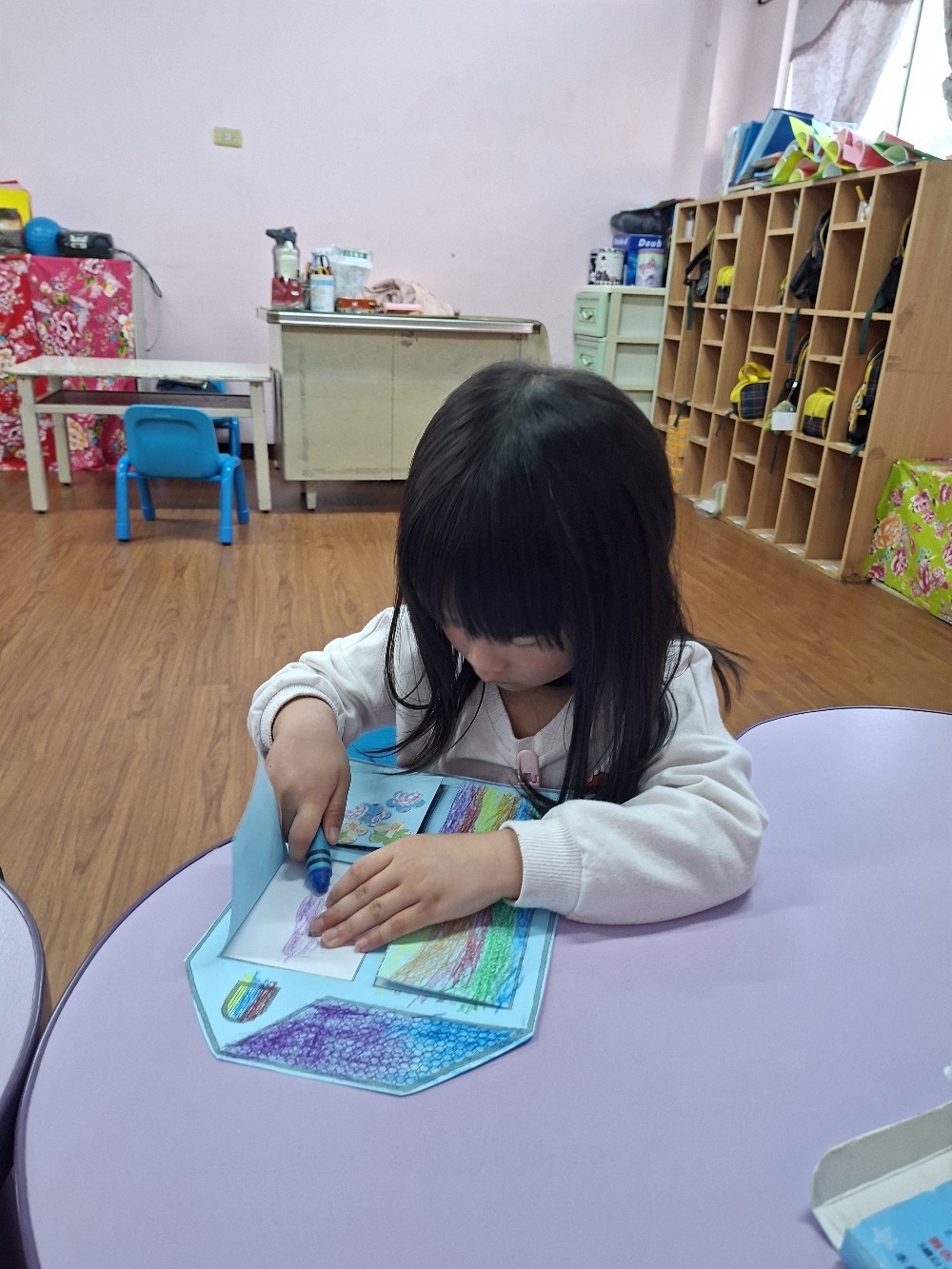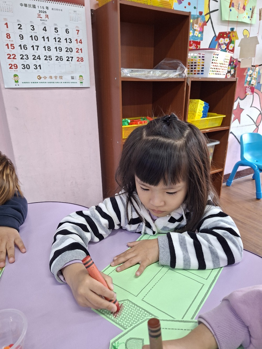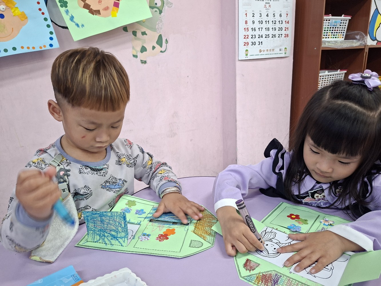認識家人稱謂間的關係,小朋友運用蠟筆進行彩繪,完成溫暖的家