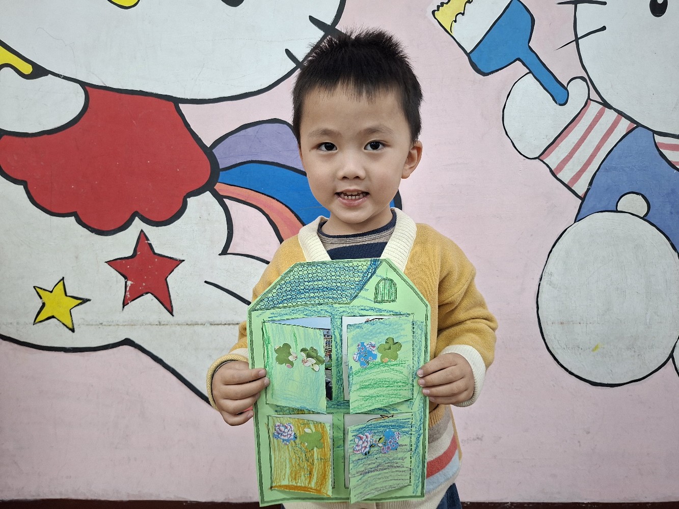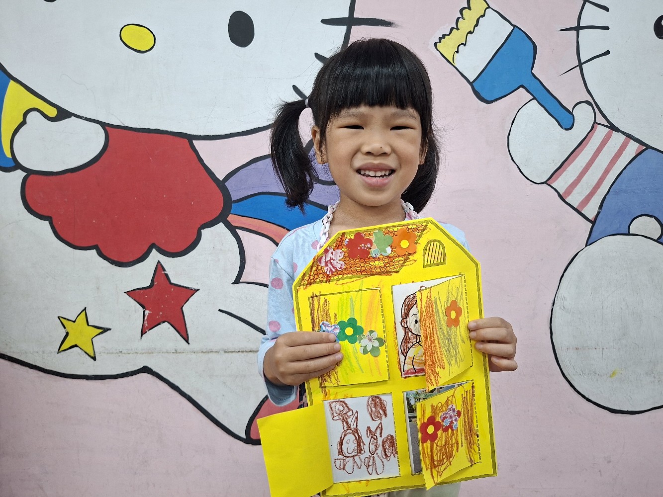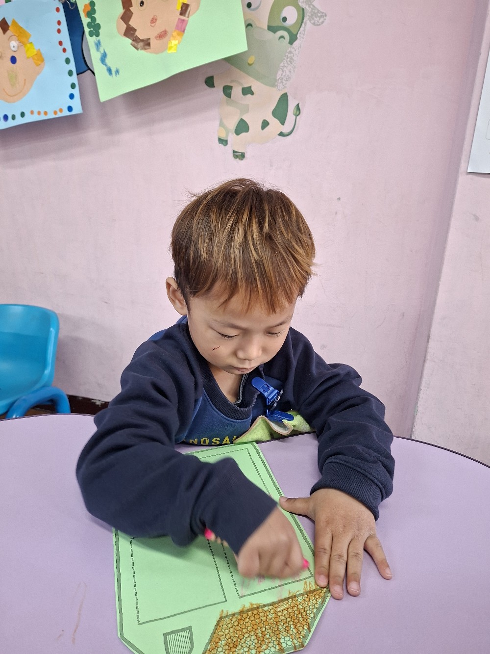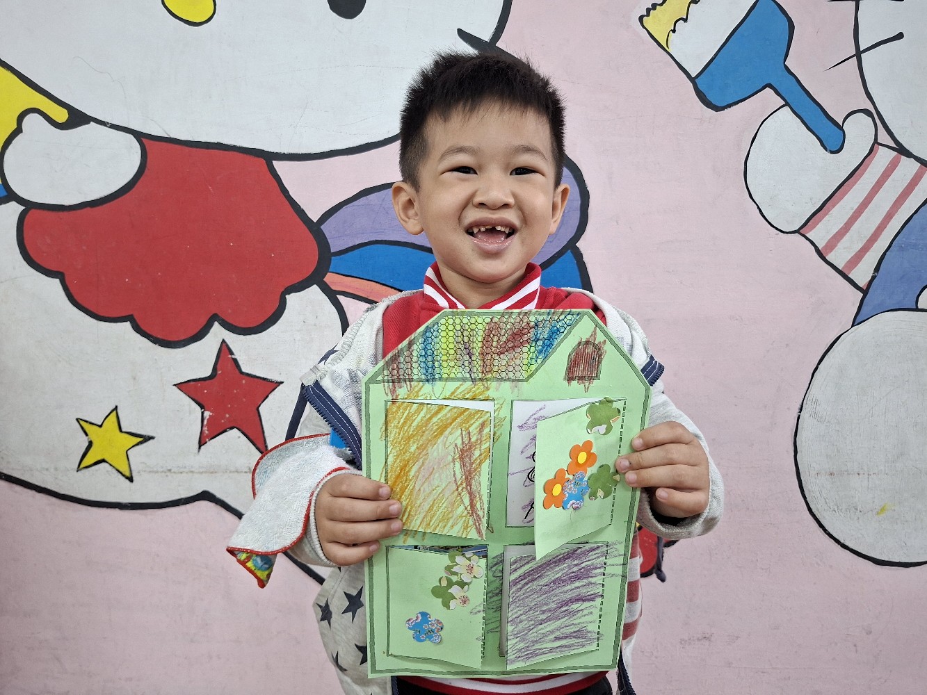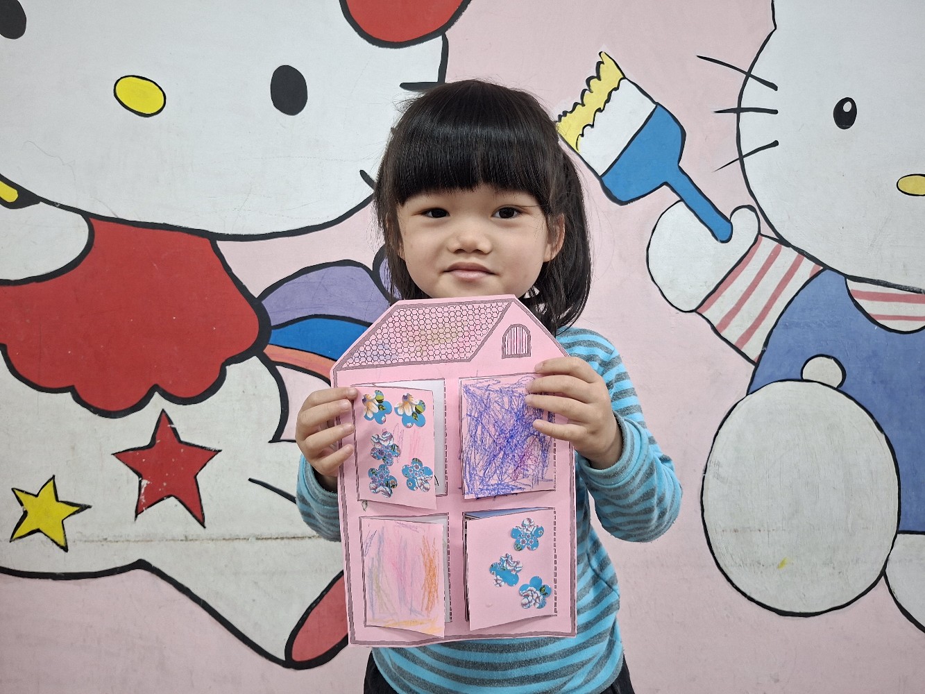 認識家人稱謂間的關係,小朋友運用蠟筆進行彩繪,完成溫暖的家